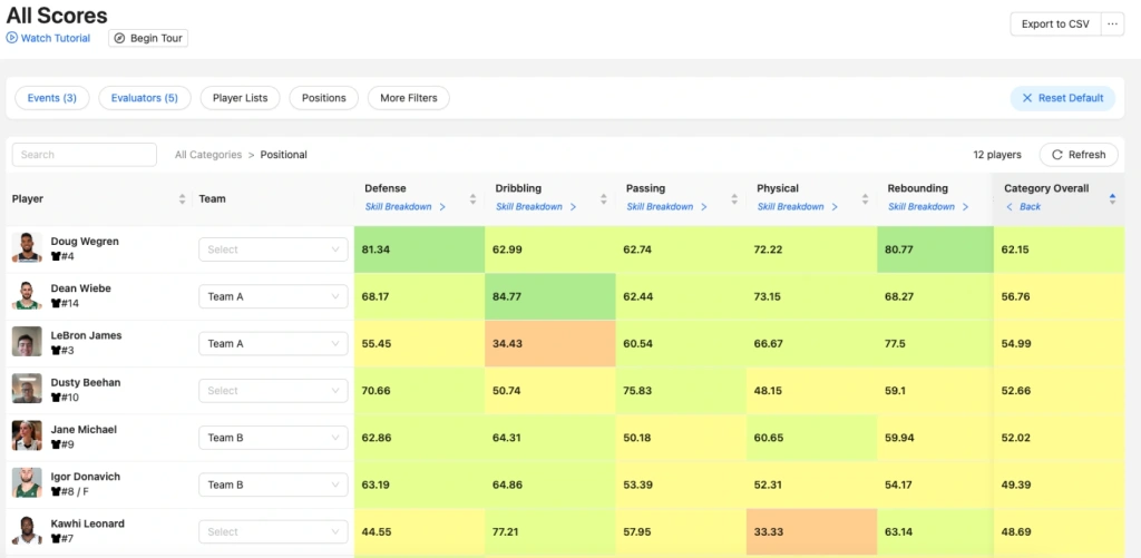 Below is an all-scores report for a basketball team. By clicking the arrow button on any column, coaches can instantly see how players rank across core skills (passing, dribbling, defense, etc..) or overall.