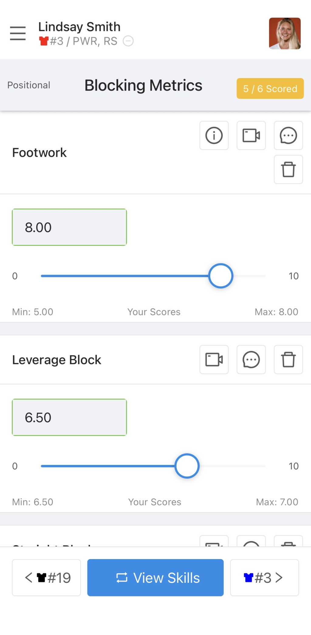 Quickly score players using the slider button. *Comments and video can be added as well.