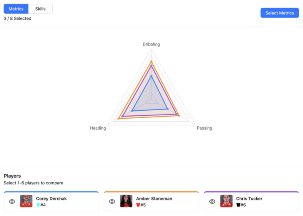 1) Player rankings- Rank players from highest to lowest to gain accurate insights into which player(s) are the top performers. You can either view how players rank overall or within a specific skill. I.e., dribbling, shooting, or passing in soccer.