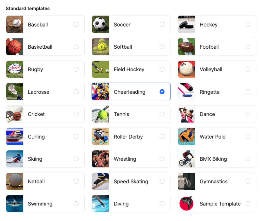 Note: If your sport is not in this list, click on 'Sample Template.' From here, you can change to pre-set metrics for your desired sport.