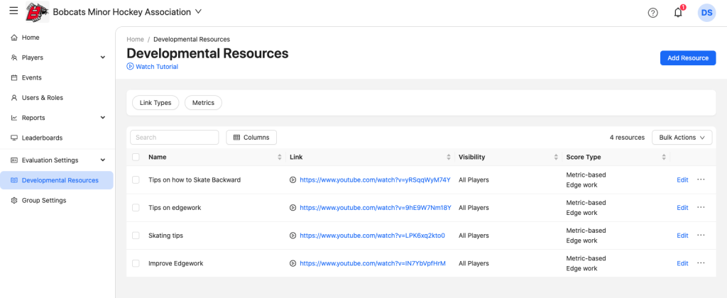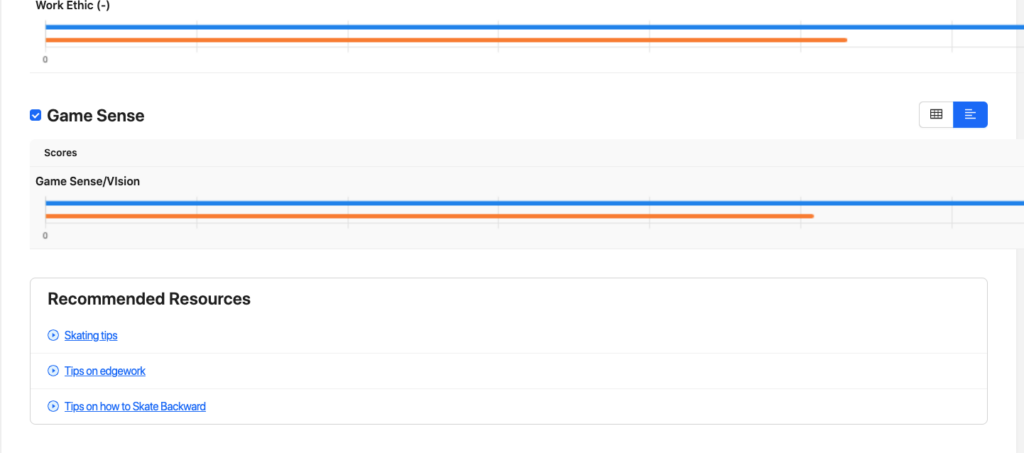 On a player’s individual report, any developmental resources will be at the bottom of the report card under ‘Recommended Resources.’