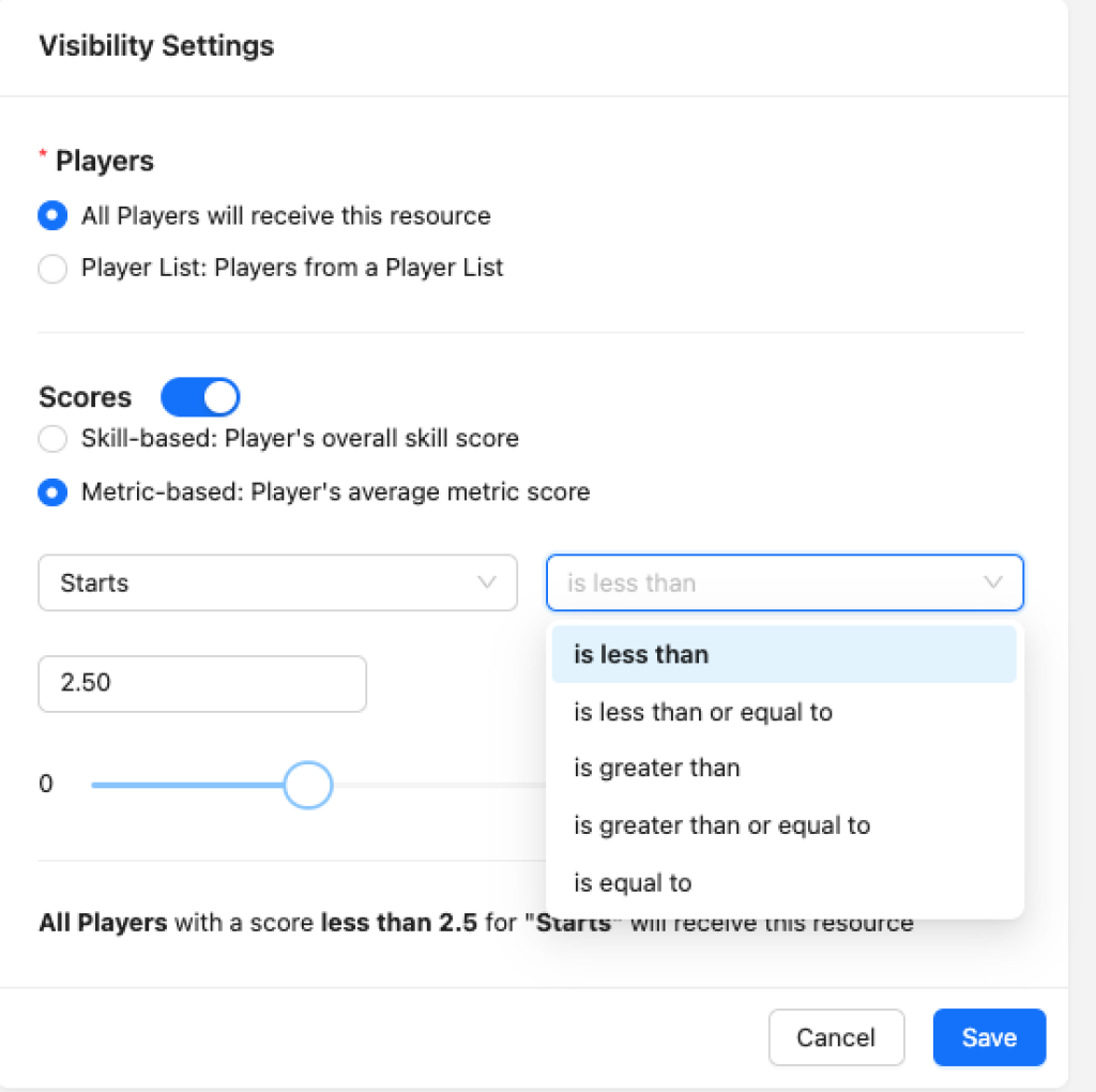 Note: In most cases, you will want to distribute a developmental resource when a player’s score ‘is less than‘ or ‘is less than or equal to.‘