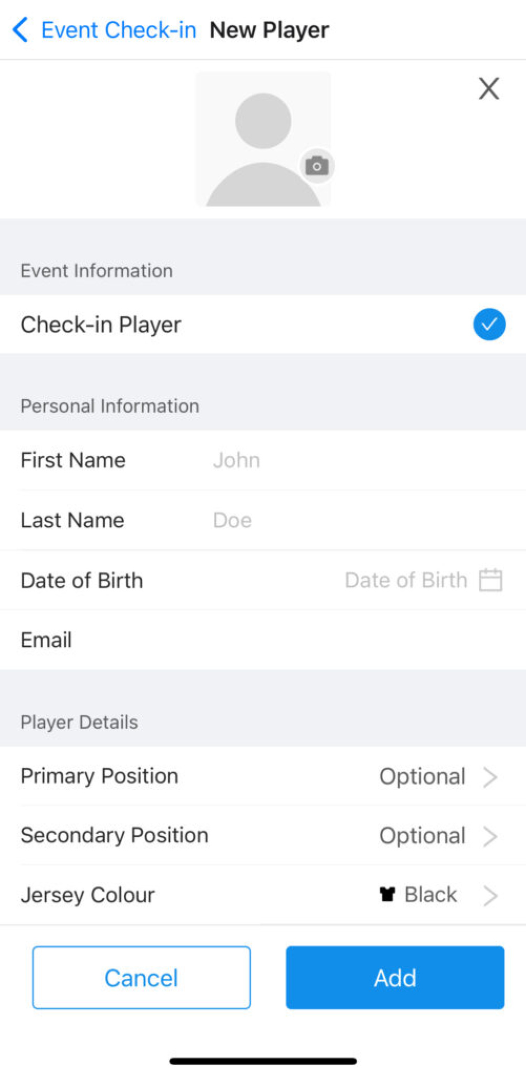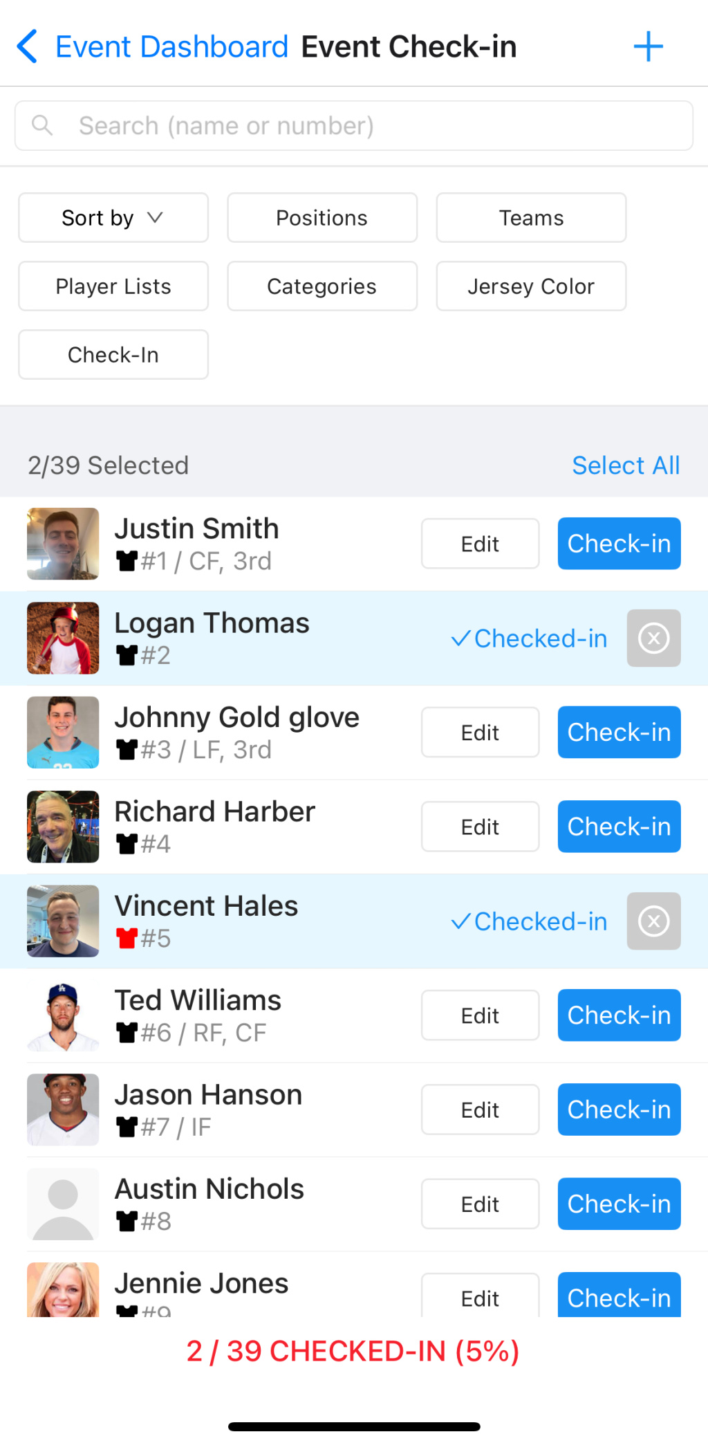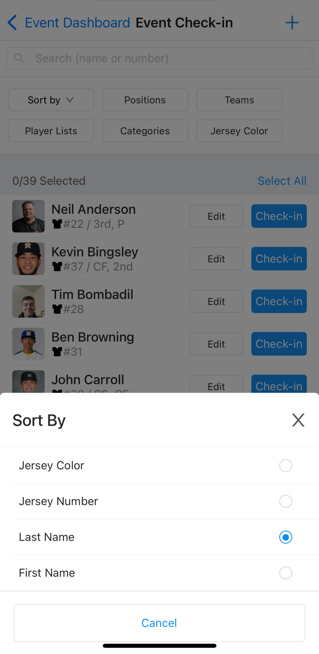 Note: For easy check-in, sort players by first name, last name, jersey colour, or jersey number. Additionally, you can search for players by typing any name or jersey number in the navigation bar.