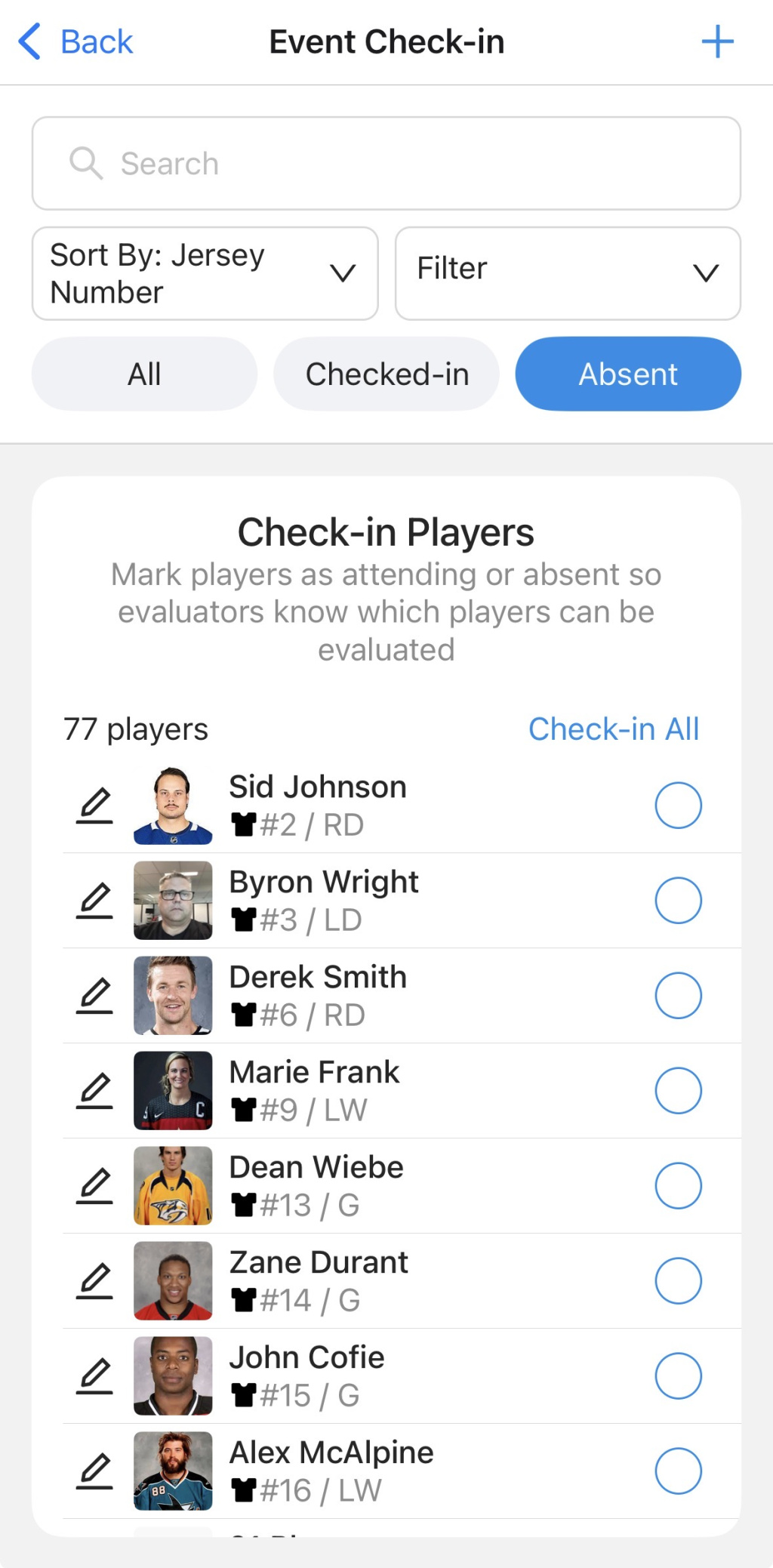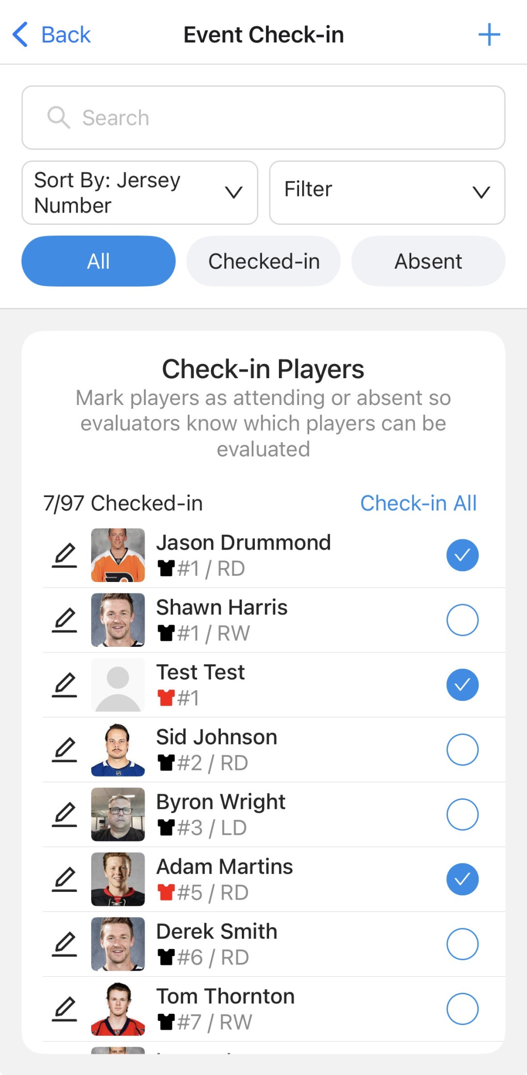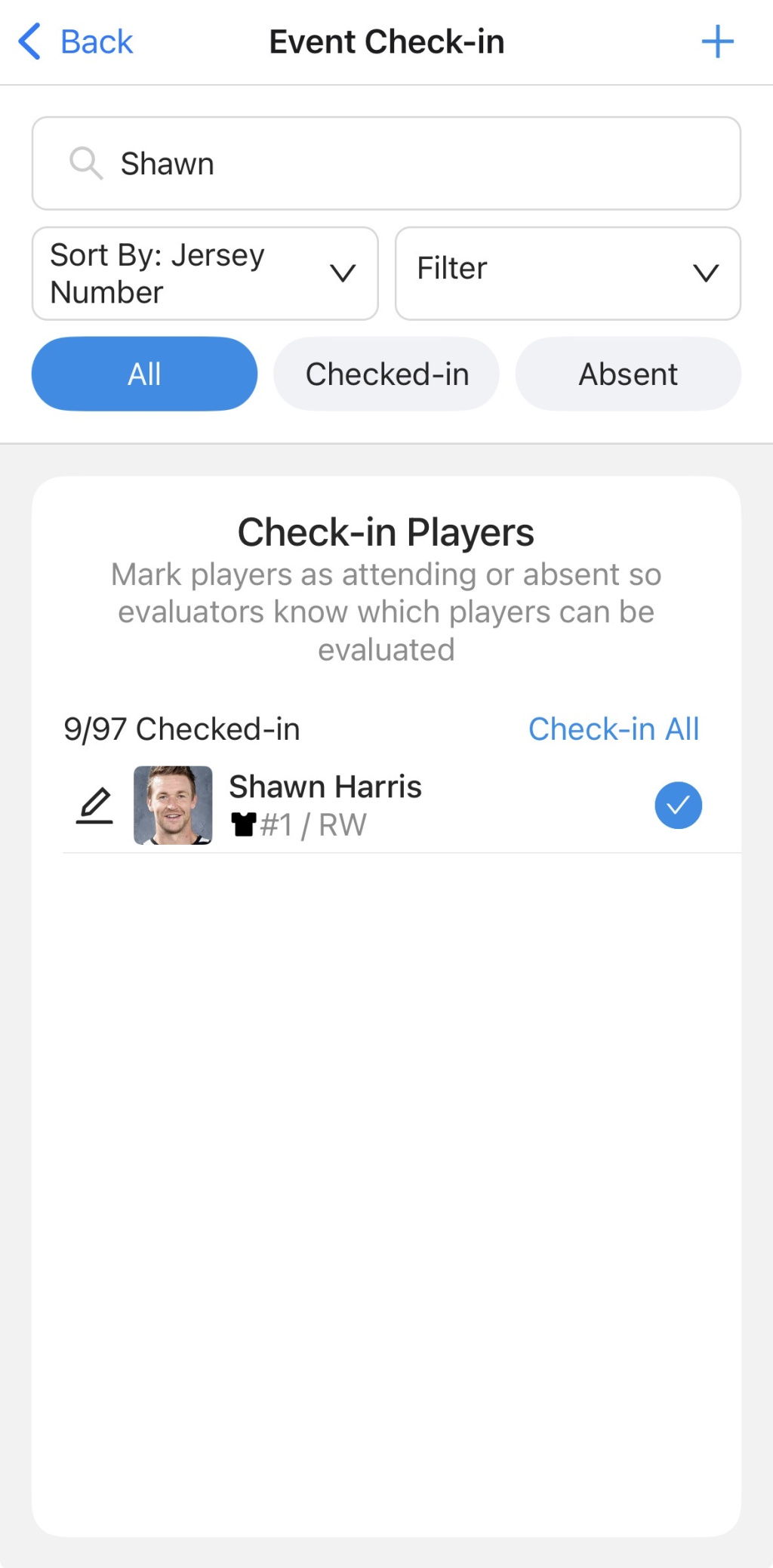 For instant status tracking, you can view checked-in and absent players by navigating to the respective tabs at the top.