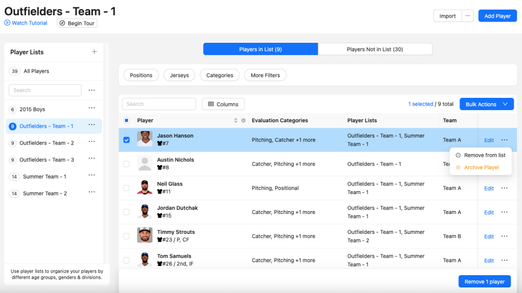 To remove a player, click the three dots on the far right beside a player's name and click 'Remove from list.'