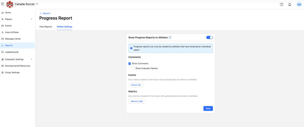 Toggle on the ‘Show Progress Reports to Athletes.’