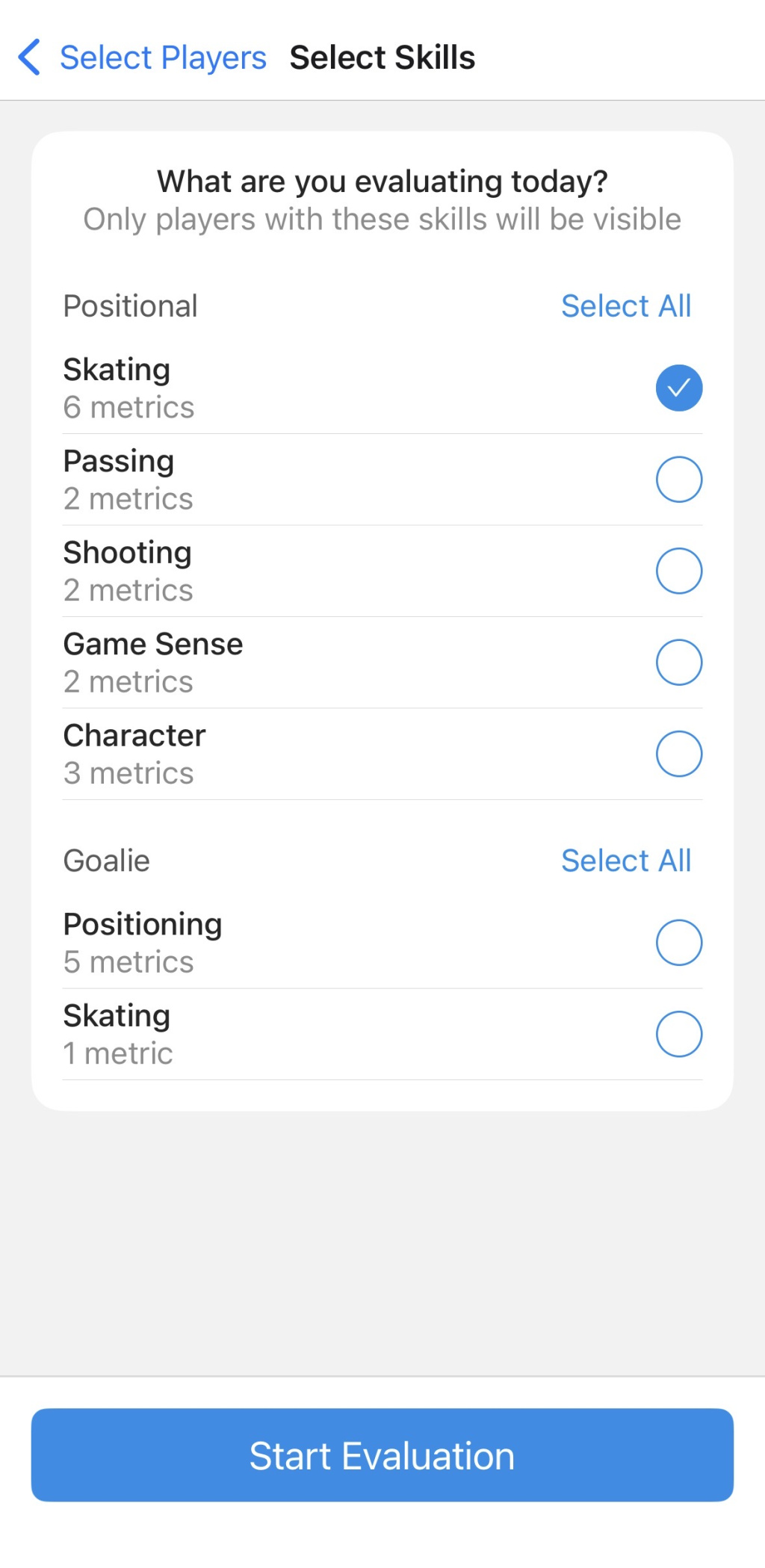 As evaluators oftentimes will only be assessing players on a single skill, they can select which skill (i.e., passing, skating, or shooting) to evaluate.
